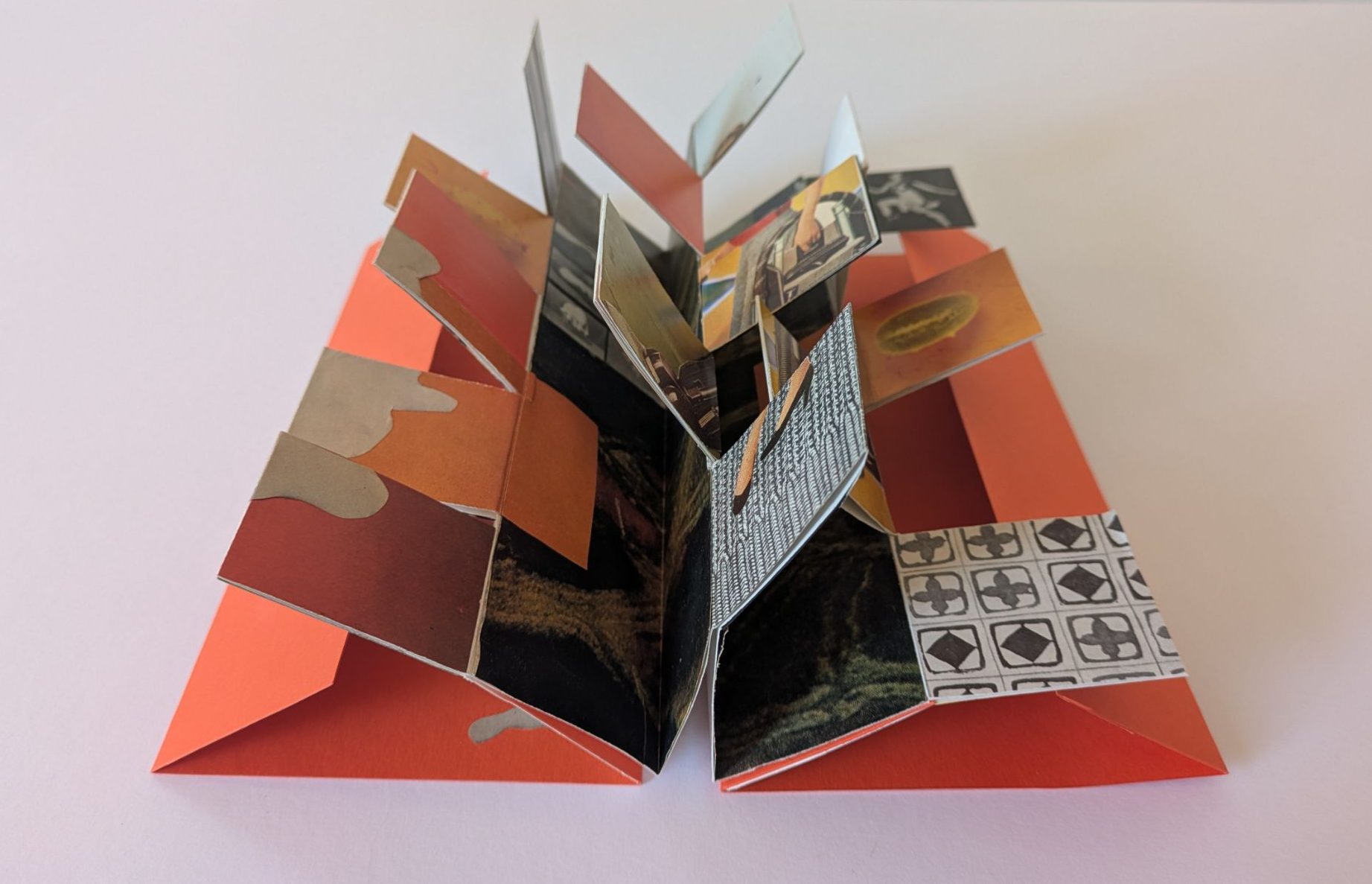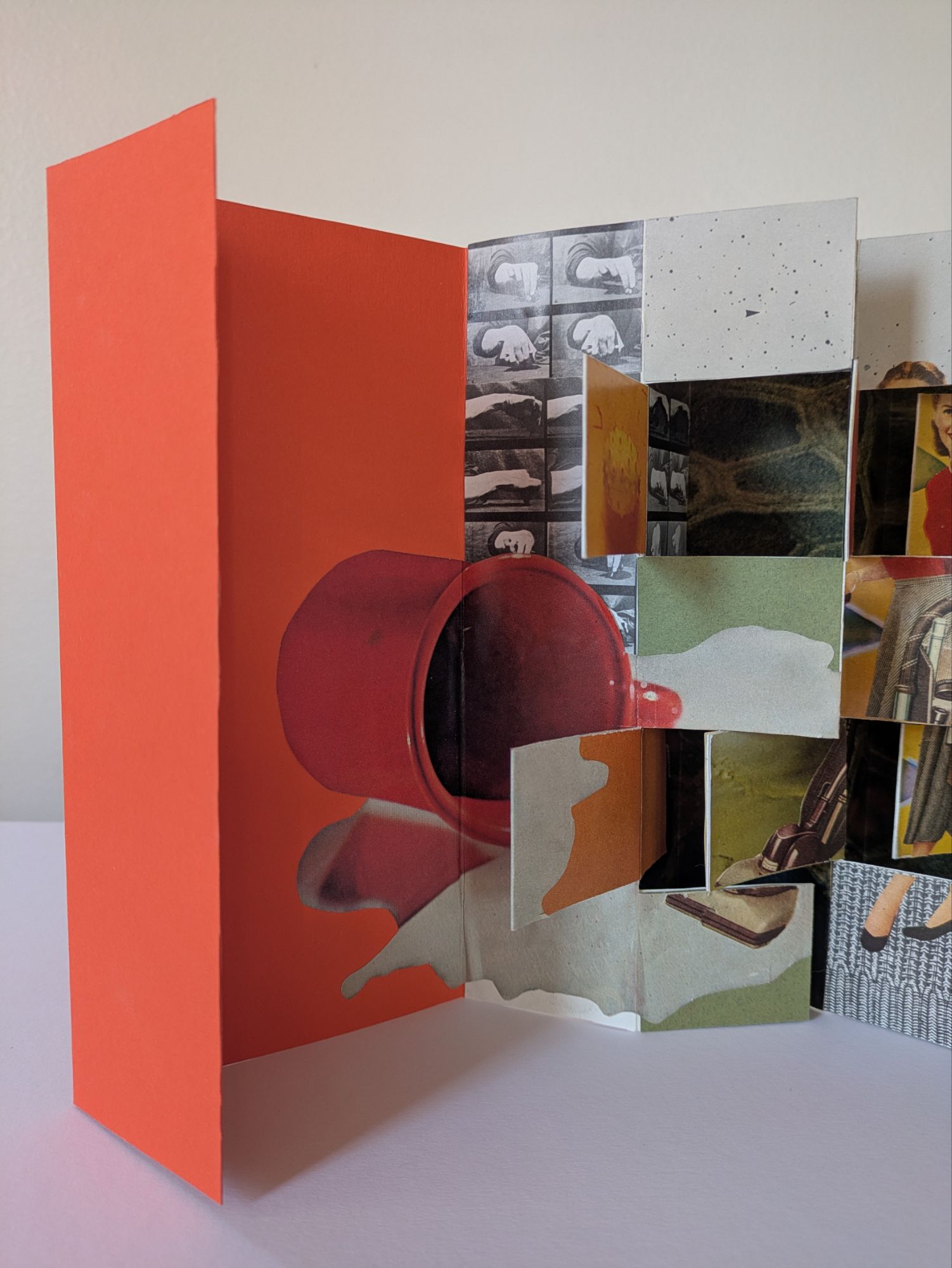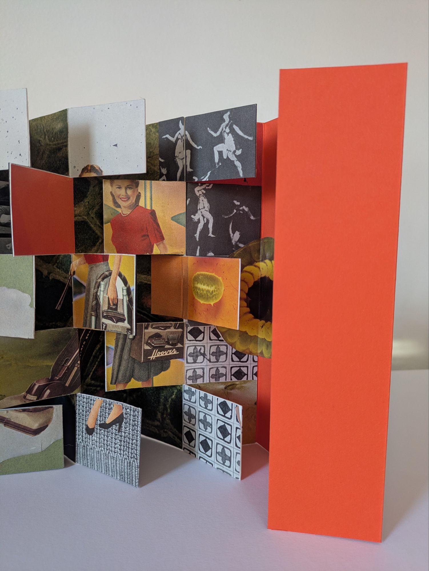 This colorful and pattern-heavy book uses the Interlocking Loops book structure. Meant to be displayed upright, the tabs can be turned to align the disjointed imagery or turned to reveal the ‘back’ side.