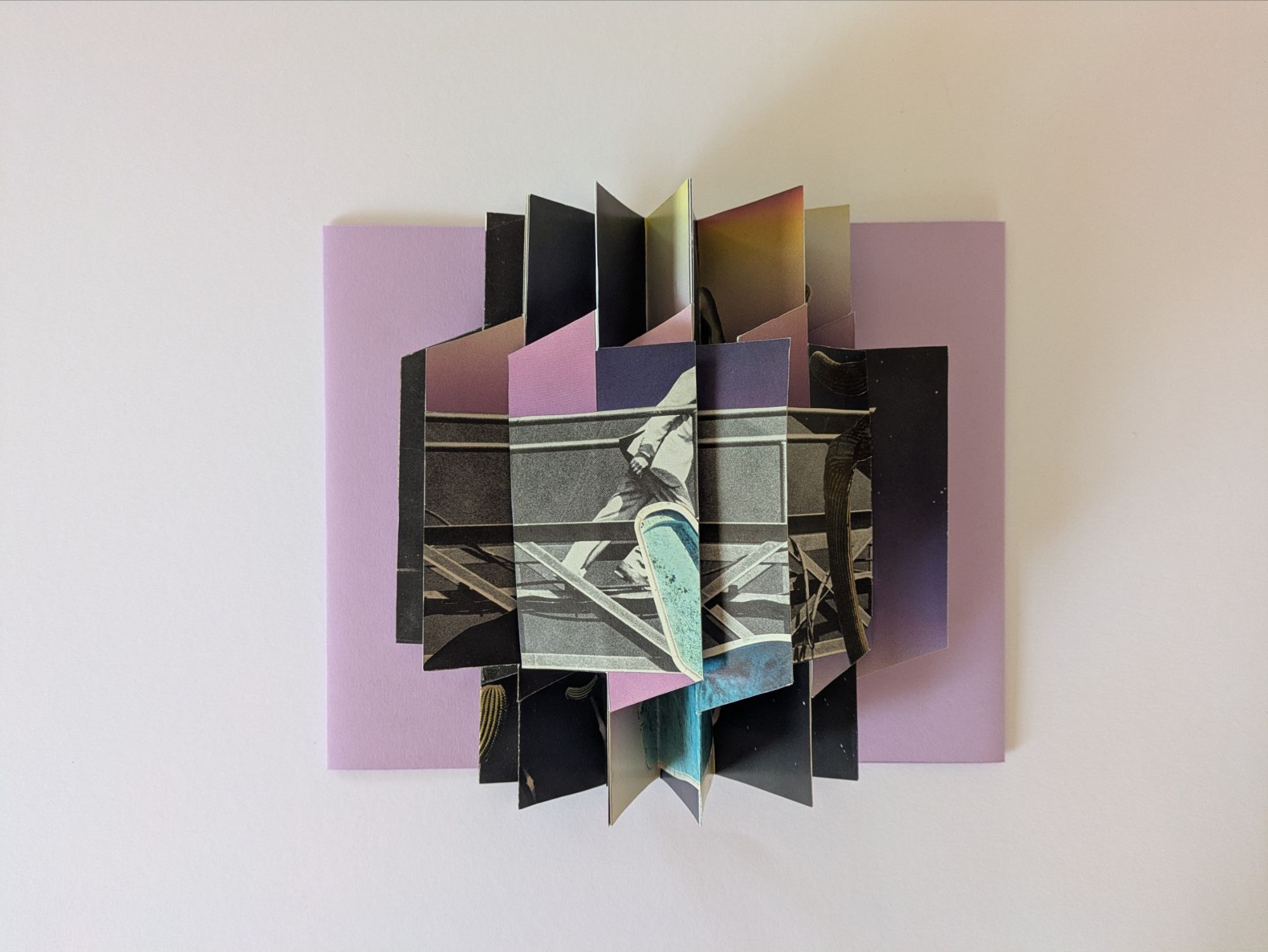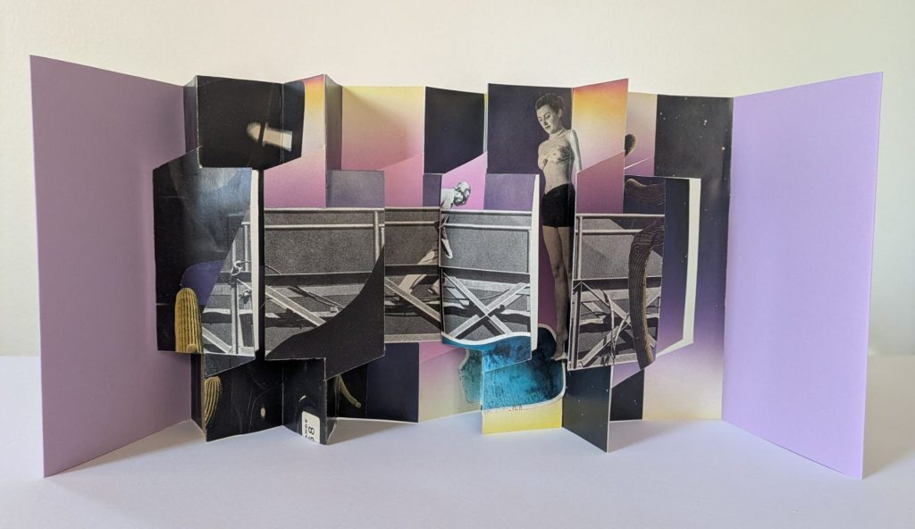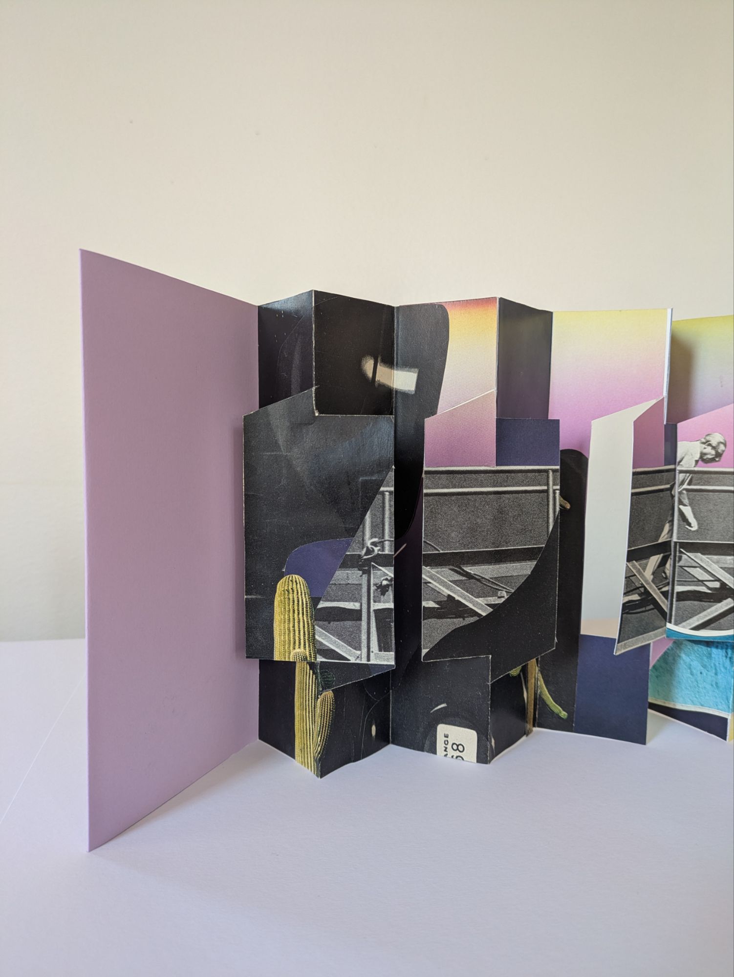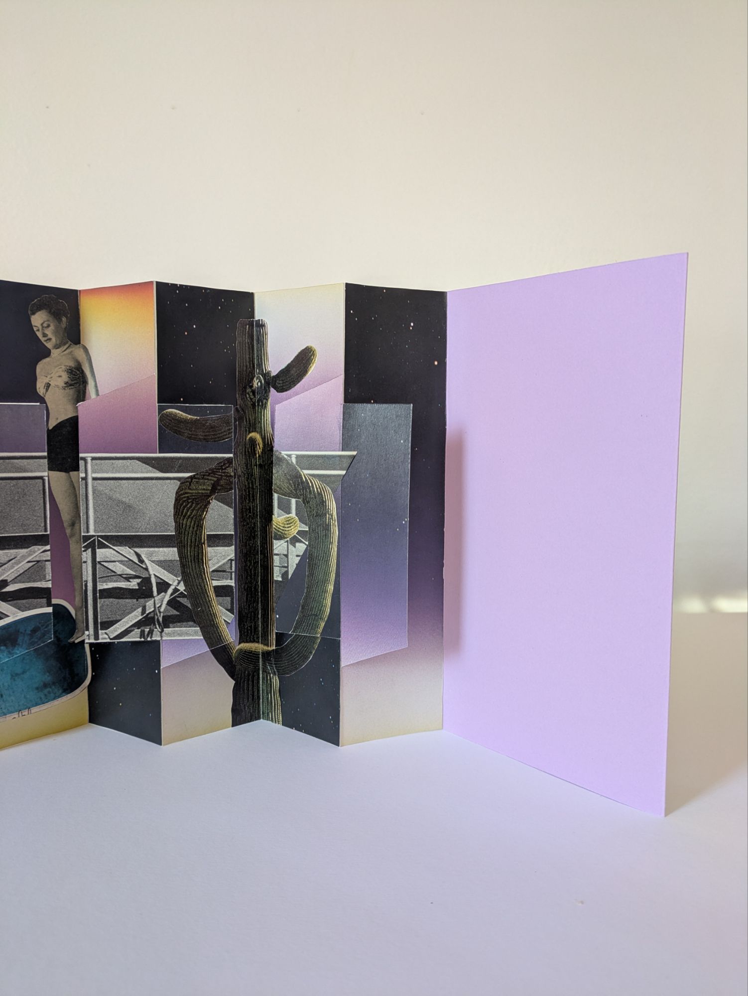 This book utilizes the Panorama Book structure, a structure that is stable when displayed upright. This stability allows viewers to interact with the flaps, turning right or left to reveal the imagery in the folds or creating a continuous image along the flaps themselves.